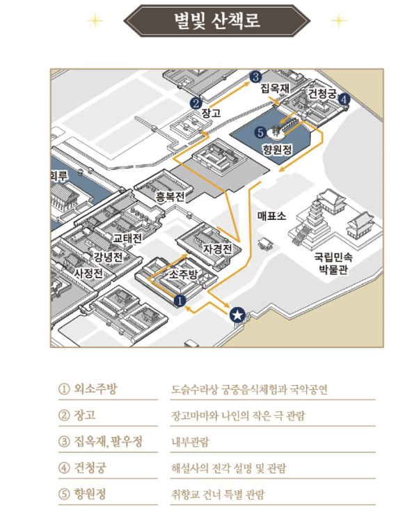 - 내용: 경복궁 소주방 궁중음식체험, 북측권역 전각에 대한 해설을 들으며, 경복궁의 역사와 문화, 조경 등을 체험