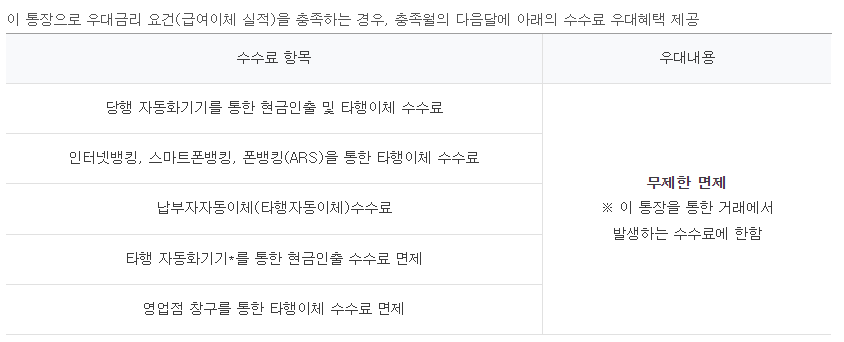 인터넷 뱅킹으로 이체할 일이 많기 때문에 수수료 무료인 통장도 중요해요! 이체할 때마다 이체 수수료 내지말고 무료로 이체하세요. 급여이체 실적이 있으며 수수료도 무제한 면제입니다!
