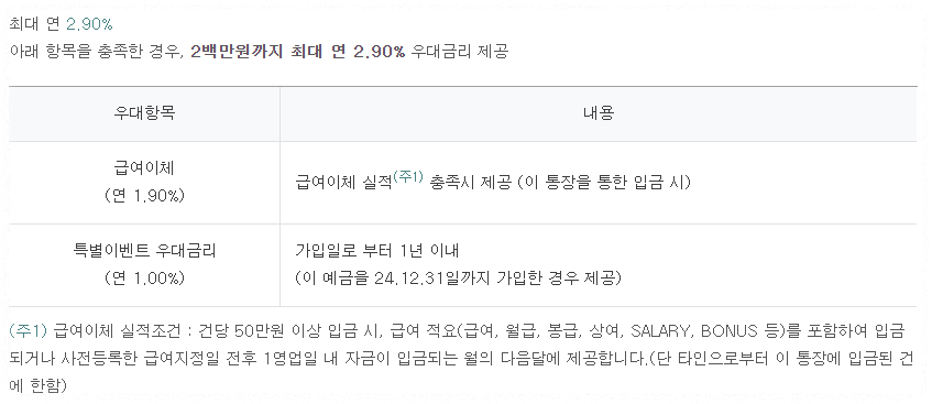 가입만 하면 주는 우대금리라니 그냥 3%의 금리를 누구나 받을 수 있는 조건인데요, 이 1%의 특별 이벤트 우대금리는 30만명에게 선착순으로 1년간 적용된다고 하니 빨리 가입하세요.