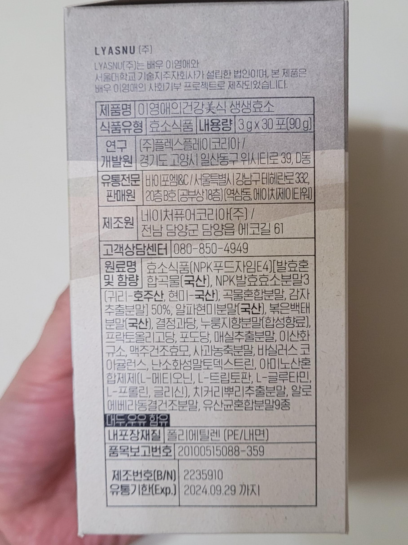 배우 이영애가 중소기업을 지원하는 재능기부 사업으로 서울대와 공동개발해서 제작한 효소라고한다.