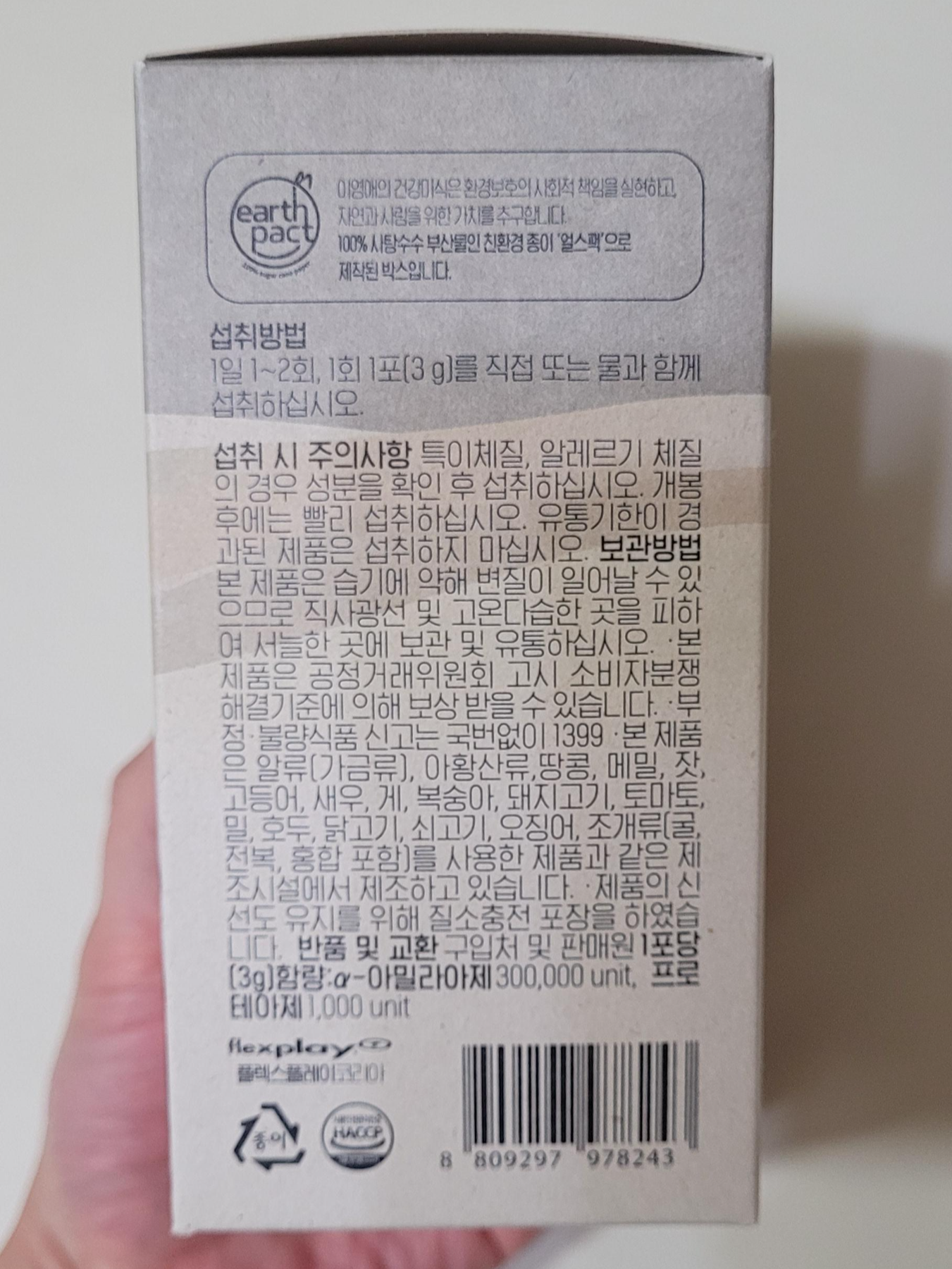 건강미식 생생효소에는 한포당 400,600 unit이 보장 된다고 소개하고 있어서 믿을만 하다고 생각했다. 장기간 식도염약을 복용중이기 때문에 최대한 순한 성분이 끌렸고 잘못 먹으면 증상이 더 심해질 것 같아서 소량 구매해서 먹어보기로 했다.