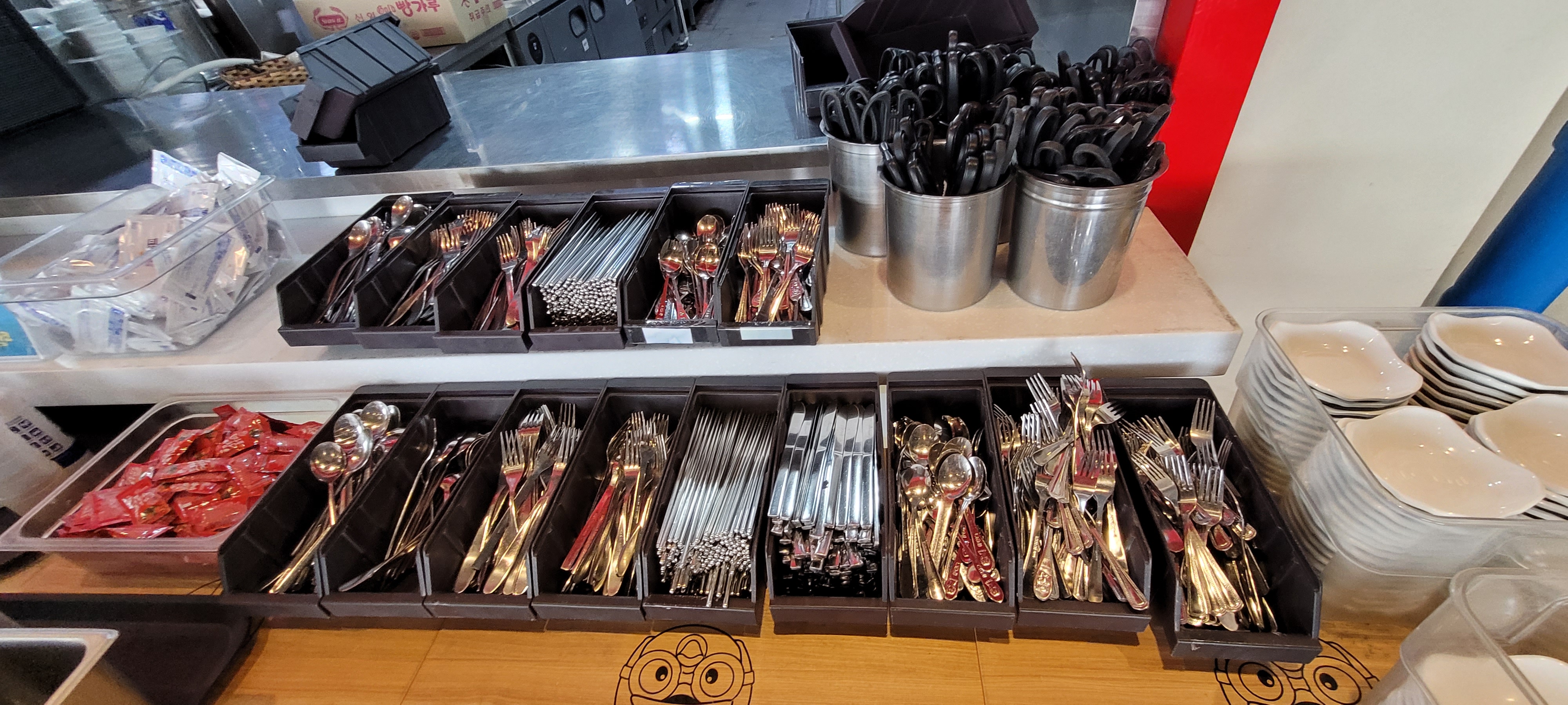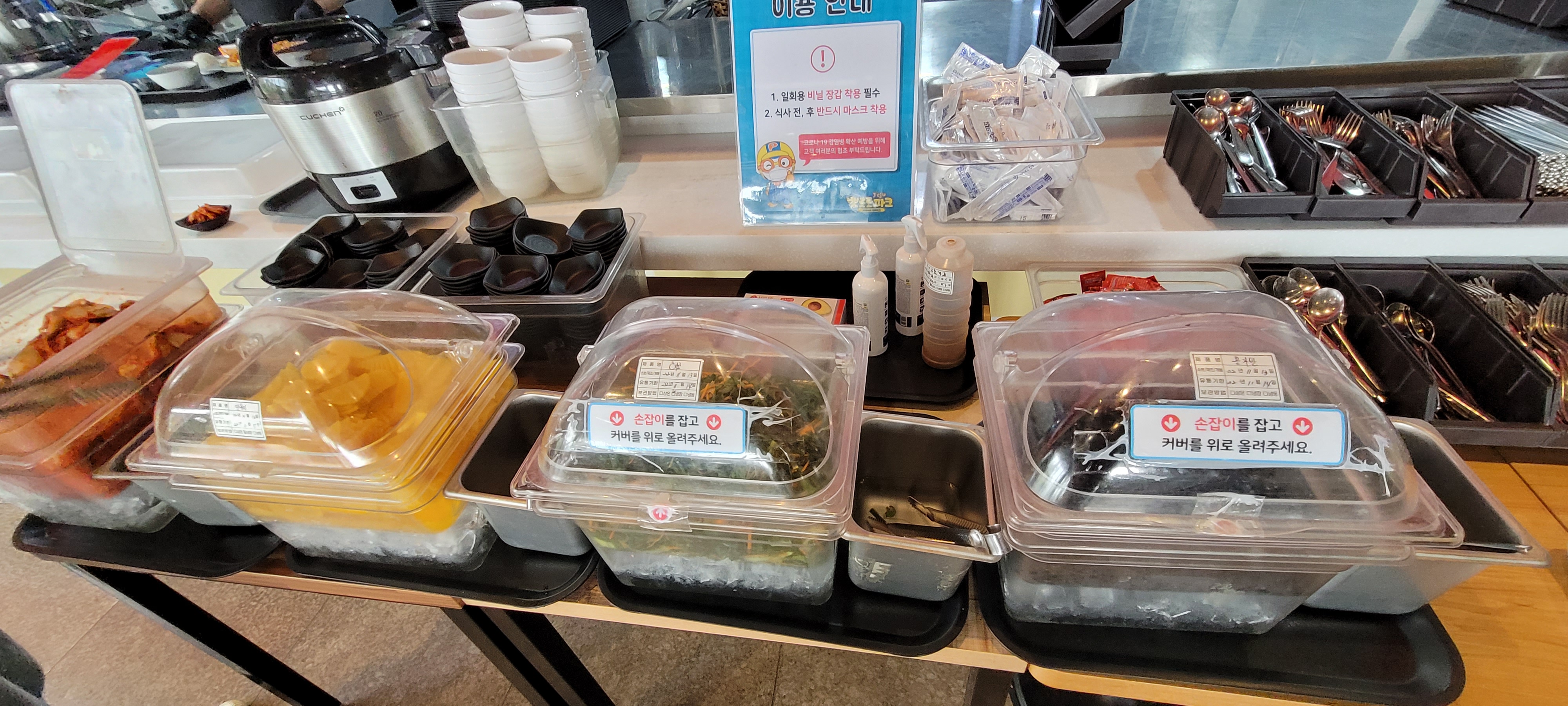 아이들이 많이 오는 곳답게 아기 의자는 당연히 있어서 가져다가 쓰면 된다. 좋았던 것은 아이와 식사할 때 필요한 스푼, 포크, 가위, 앞접시 등이 잘 구비되어 있고 자유롭게 가져다 쓸 수 있도록 비치된 점이다. 스푼, 포크는 자주 떨어뜨리는데 편하게 가져다 쓸 수 있어서 좋았고 간단 반찬도 편하게 가져올 수 있다.
