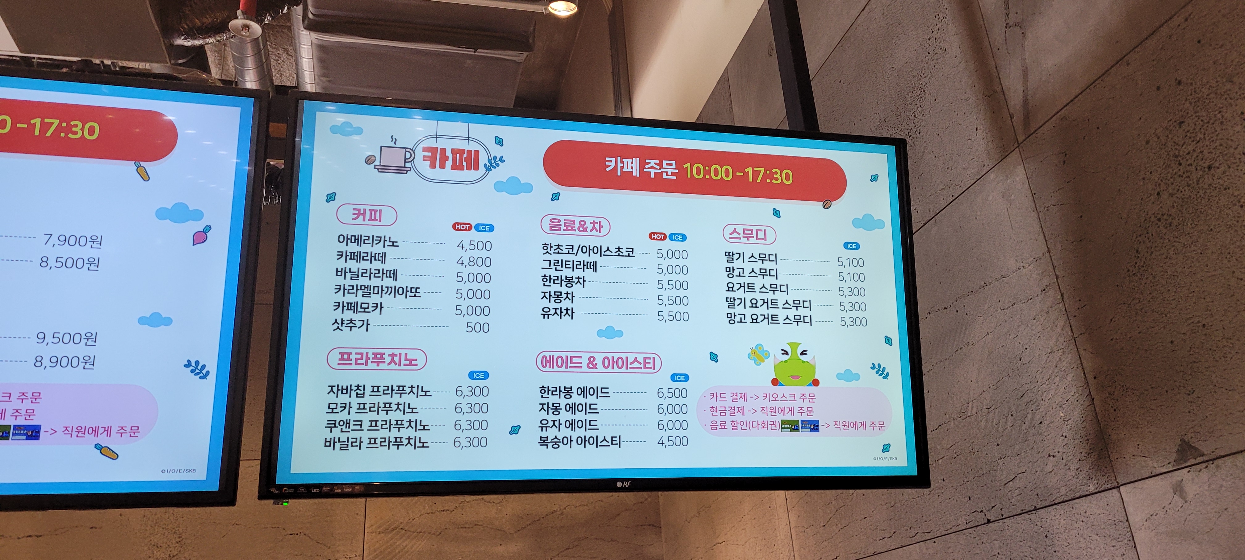 운영시간은 11:30-17:30으로 우리는 싱어롱쇼를 보고 나서가니 오픈 시간과 딱 맞았다. 깔끔하고 귀여운 캐릭터들로 꾸며져 있고 자리도 널찍해서 식당치고 쾌적한 공간이었다. 11시 30분경에는 사람이 별로 없었는데 12시~1시 사이에는 사람이 많이 들어왔다.