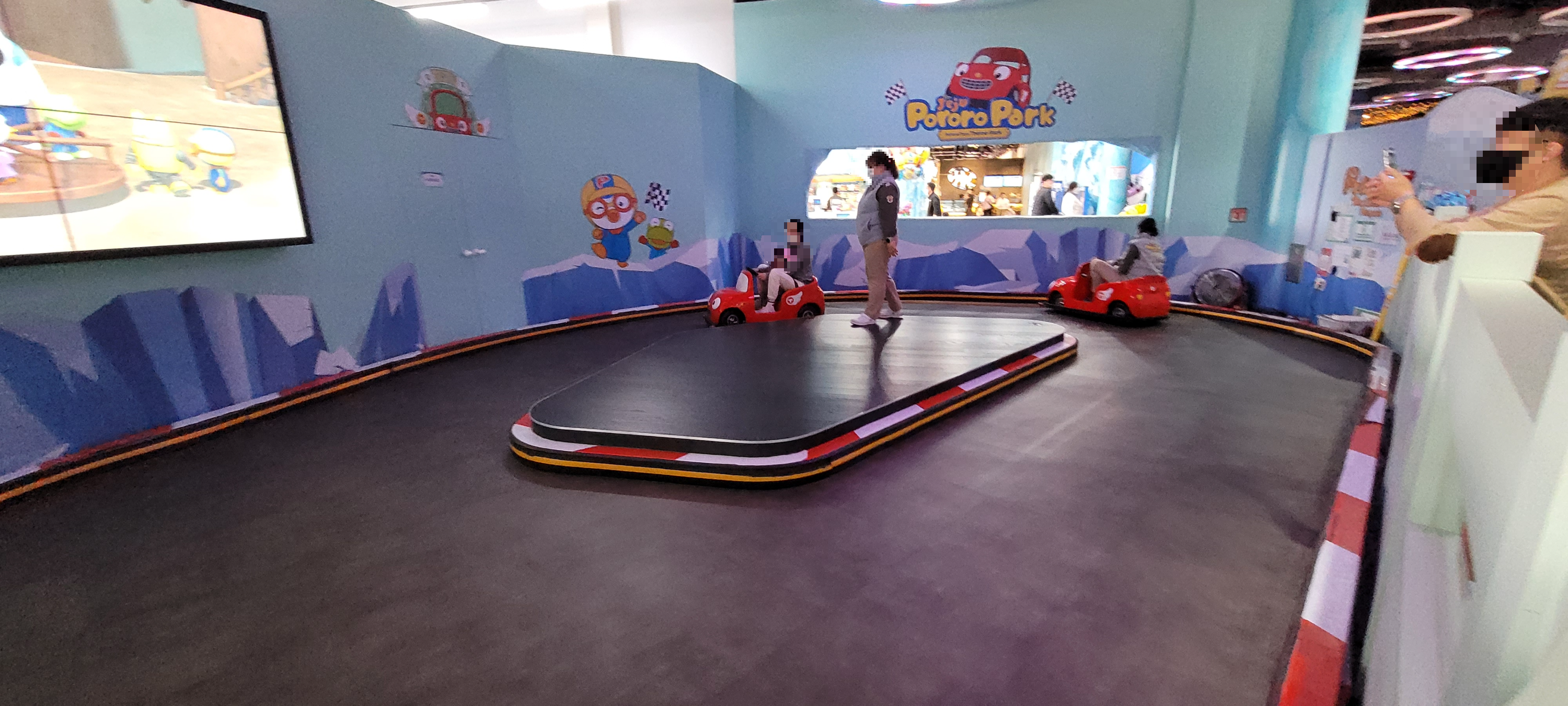 그리고 안에서 즐길 수 있는 어트랙션으로 뽀로로 기차와 뚜뚜 스피드 트랙이 있다. 곰곰이는 뚜뚜를 타보겠다고 해서 엄마와 함께 탑승했다. 실내화와 안정 모자를 착용하고 엄마와 함께 뚜뚜를 타고 트랙을 도는 것이었는데 타는 시간은 2분 정도로 짧지만 곰곰이는 재미있어했다.