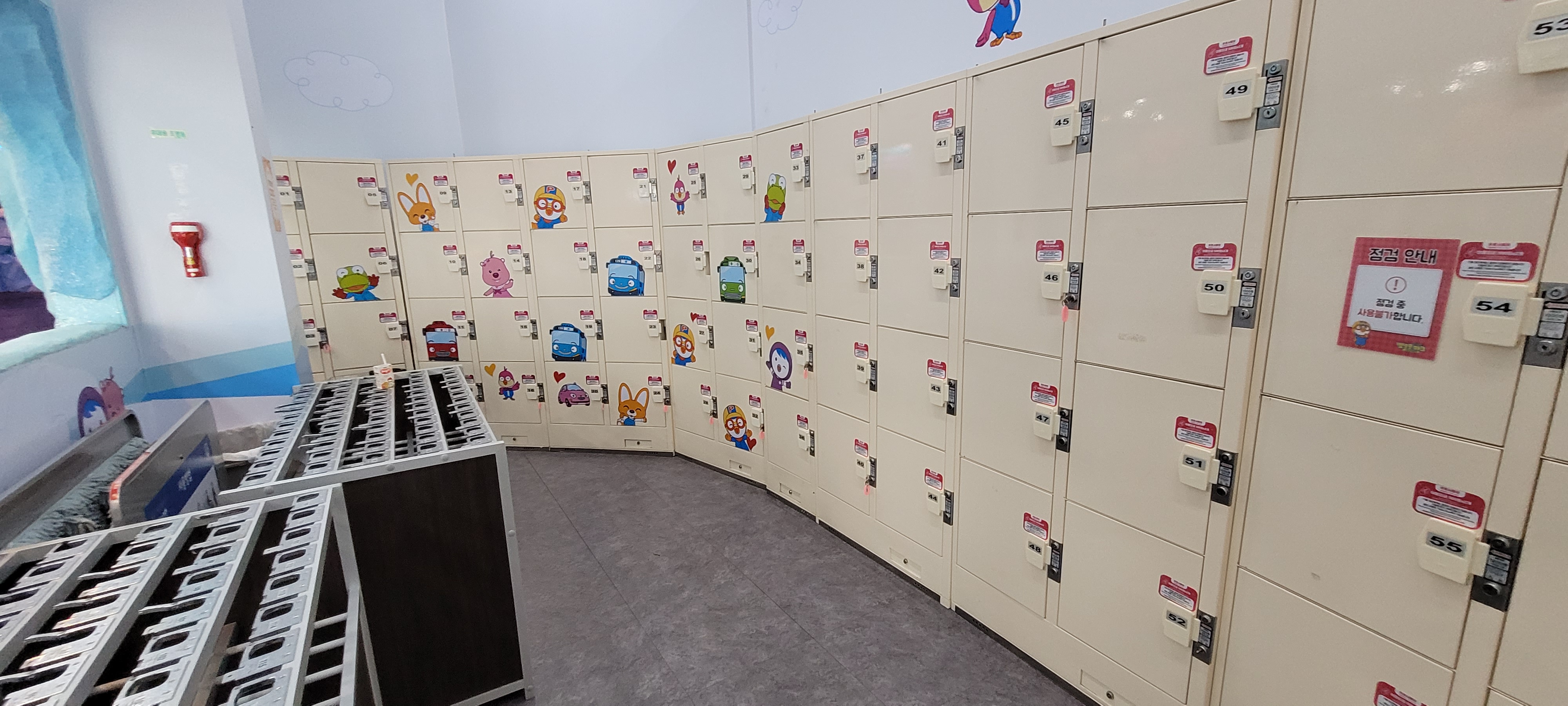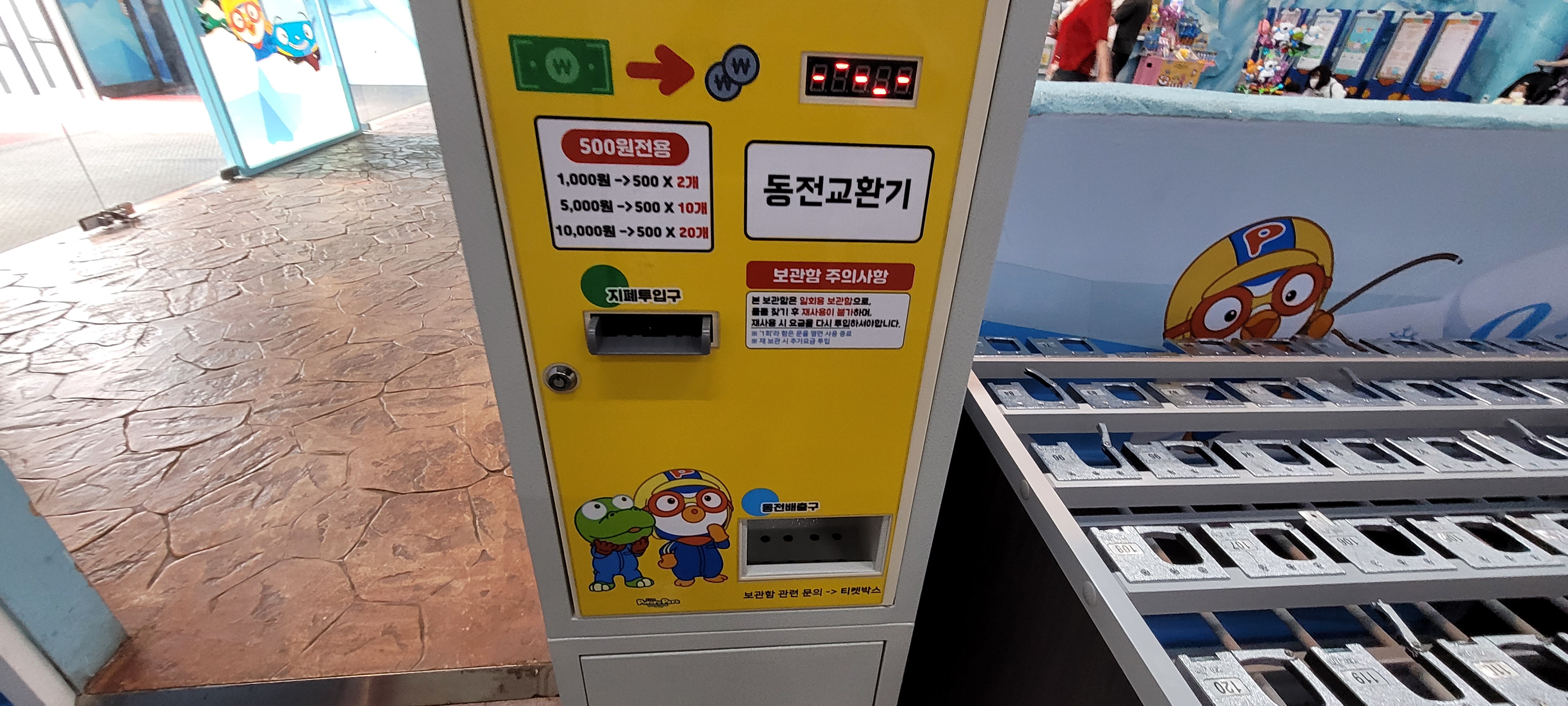실내로 들어서자마자 오른쪽에 락커가 보인다. 짐이 많으면 아무래도 불편하기 때문에 간편하게 다니는 게 좋다! 처음에는 몰라서 겉옷을 들고 다녔는데 나중에 보고 옷이랑 짐을 넣어놨다. 이용요금은 천 원! 동전교환기가 앞에 있어서 이용하면 된다.