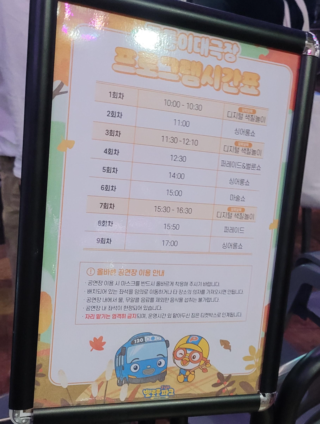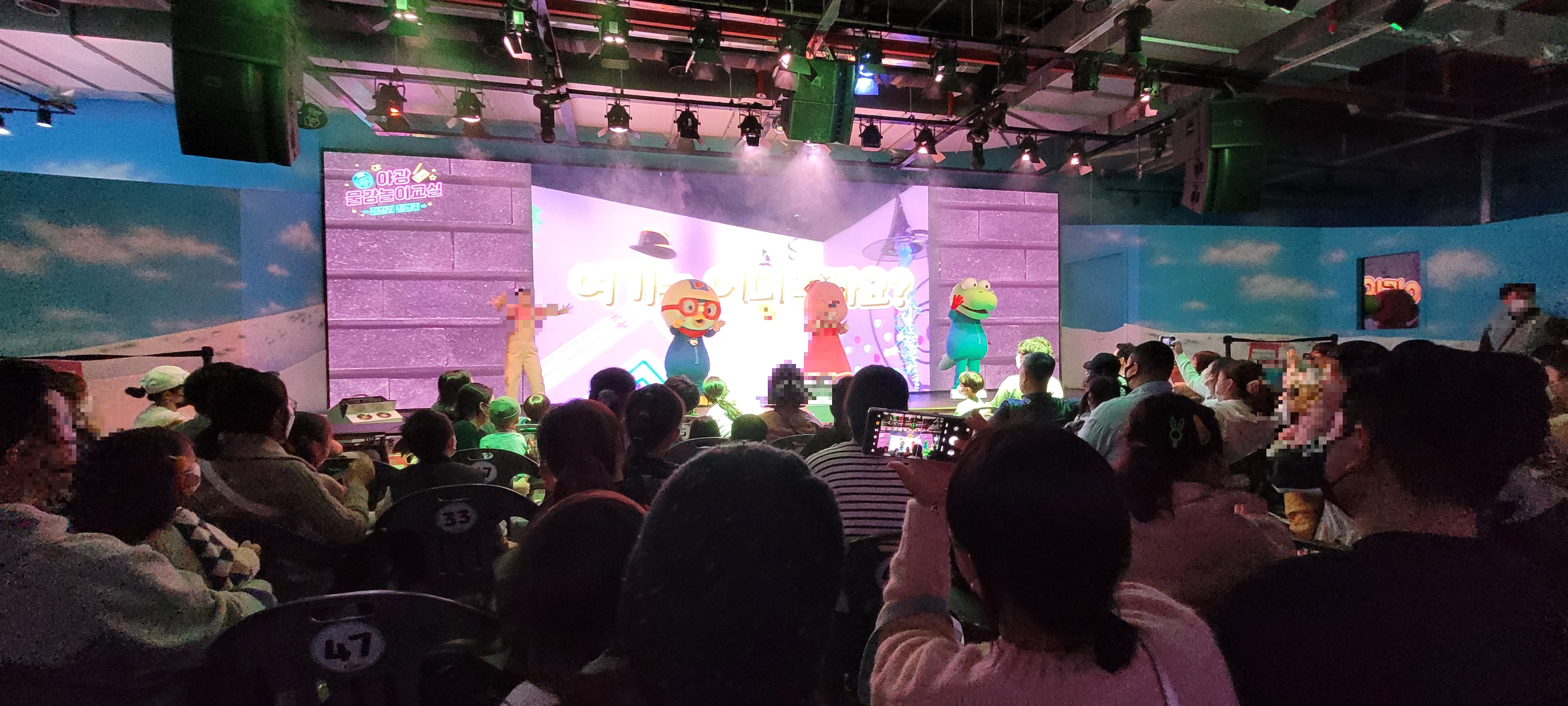 통통이 대극장에서는 뽀로로 쇼나 퍼레이드 체험활동이 이루어진다. 인기 있는 것은 아무래도 싱어롱쇼와 퍼레이드다. 시작 전에 줄을 서 있다가 앞자리에 앉는 것이 아무래도 좋다! 뽀로로를 가까이 볼 수 있고 무대 중간에 질문이나 무대 초대가 있어서 아무래도 앞자리는 뽑힐 확률이 높다! 쇼 중간에 비눗방울도 쏟아지는데 뒷자리까지는 오지 않는다ㅠ