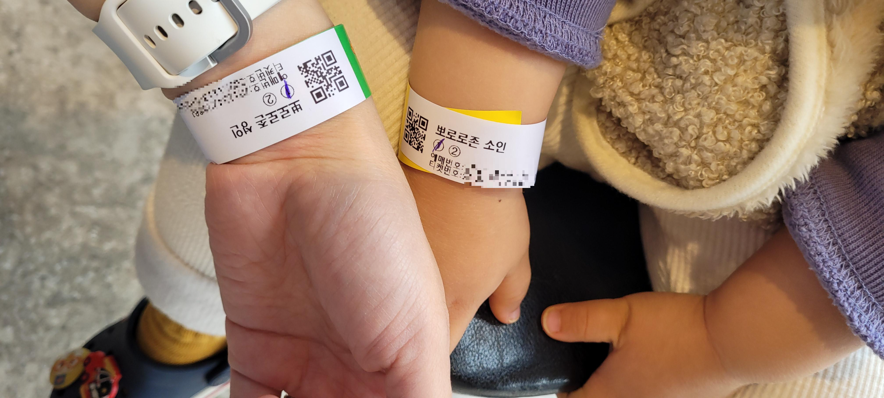 우리가 탄 것은 크롱의 회전바구니와 타요의 회전목마였다. 어트랙션 2개 이용 가능하기 때문에 보호자와 같이 탑승할 수 있는 것들로 탔다. 입장 전에 팔찌를 보여주면 팔찌에 사용한 것을 표시해준다. 포비의 후룸라이드가 인기가 많아서 줄이 길었는데 점검 시간에 걸려서 우리는 포기.. 인기 있으므로 가장 먼저 도전해 볼 것을 추천한다!