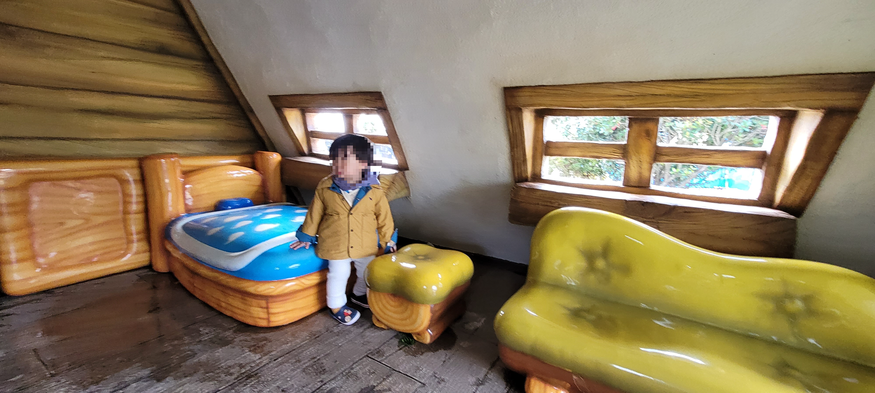 실외 공원은 뽀로로 친구들의 집과 타요버스로 아기자기하게 꾸며놨다. 곰곰이가 좋아했던 것은 타요 버스 친구들이랑 뽀로로 집이었다. 타요를 하나씩 타보고 하면서 한참 시간을 보냈고 들어가서 오른쪽에 보이는 뽀로로 집은 화면으로 보던 뽀로로의 집을 직접 들어가 봐서 신기해하는 것 같았다. 뽀로로 침대에도 누워보고 소파에도 앉아보고 아이한테는 신나는 체험이었다.