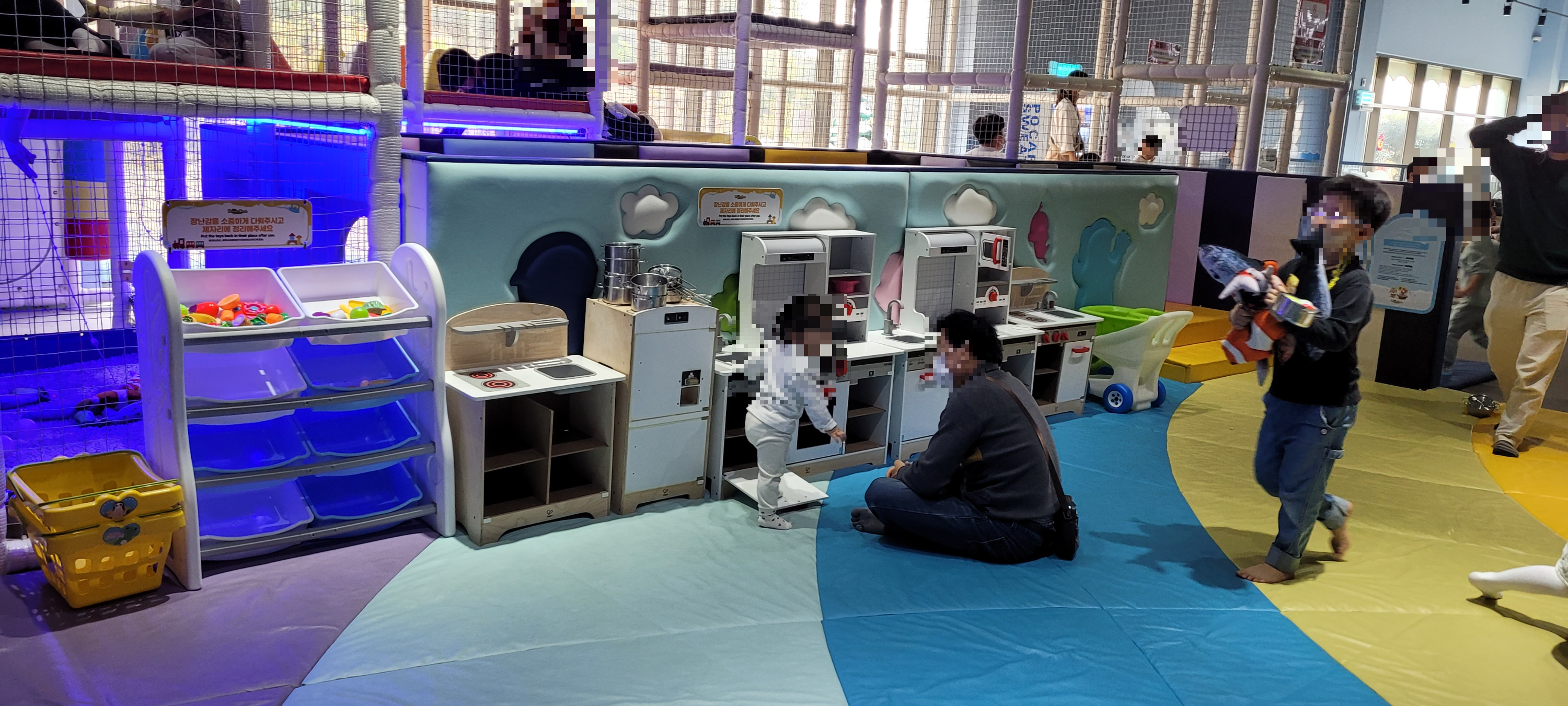 들어가기 전에 신발장이 있어서 신발을 넣고 들어가는 형식이었고 아이들이 좋아하는 볼풀, 편백, 정글짐, 낚시놀이, 주방놀이 등 다양하게 구성되어 있다.