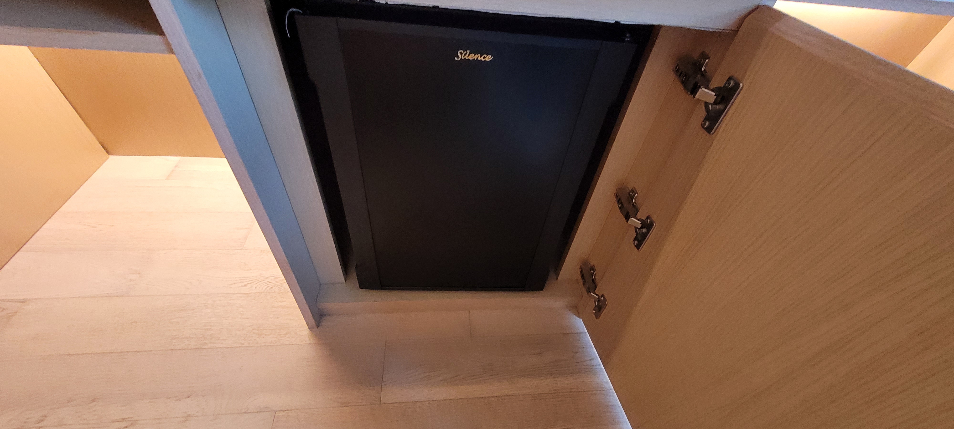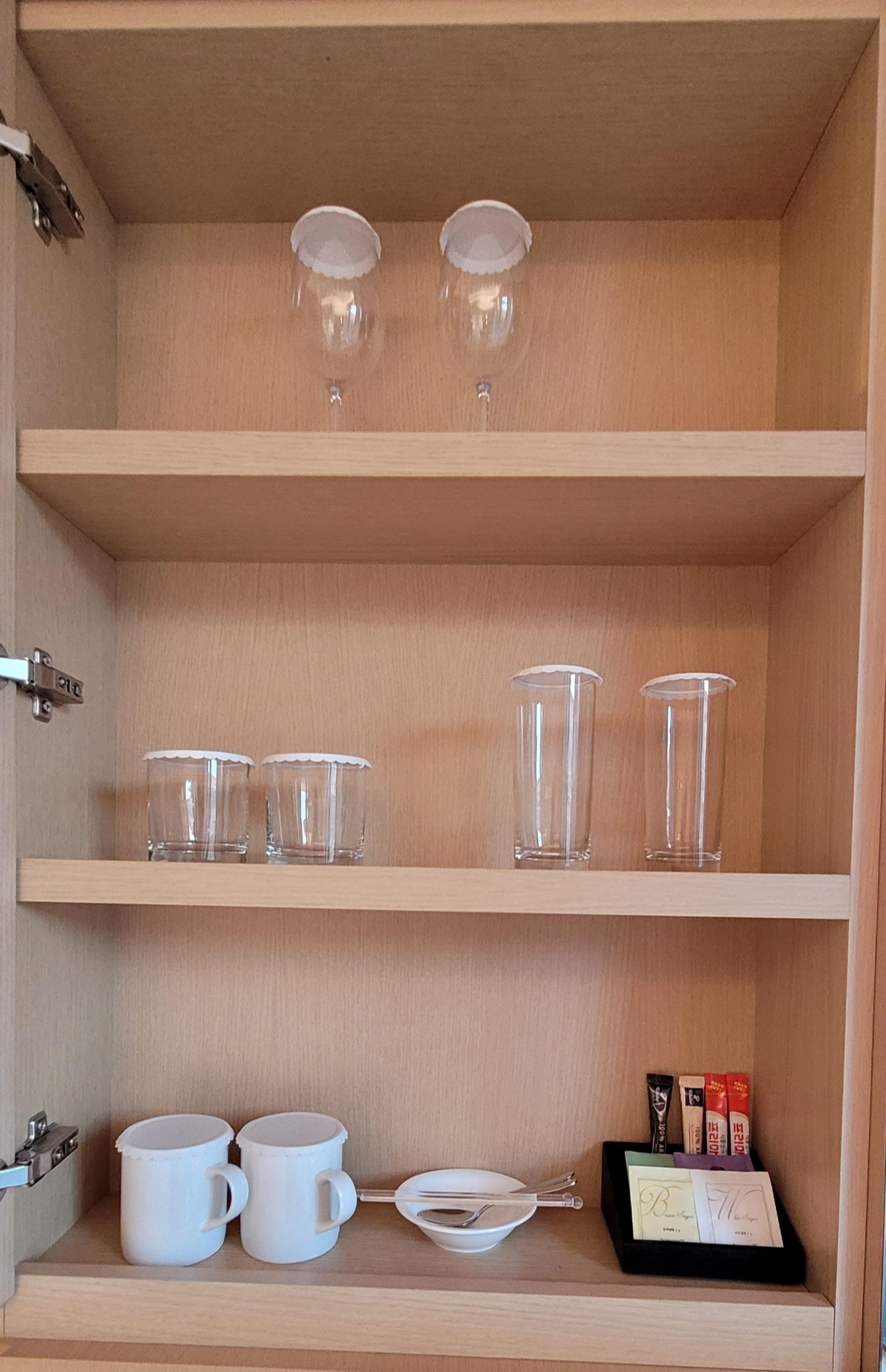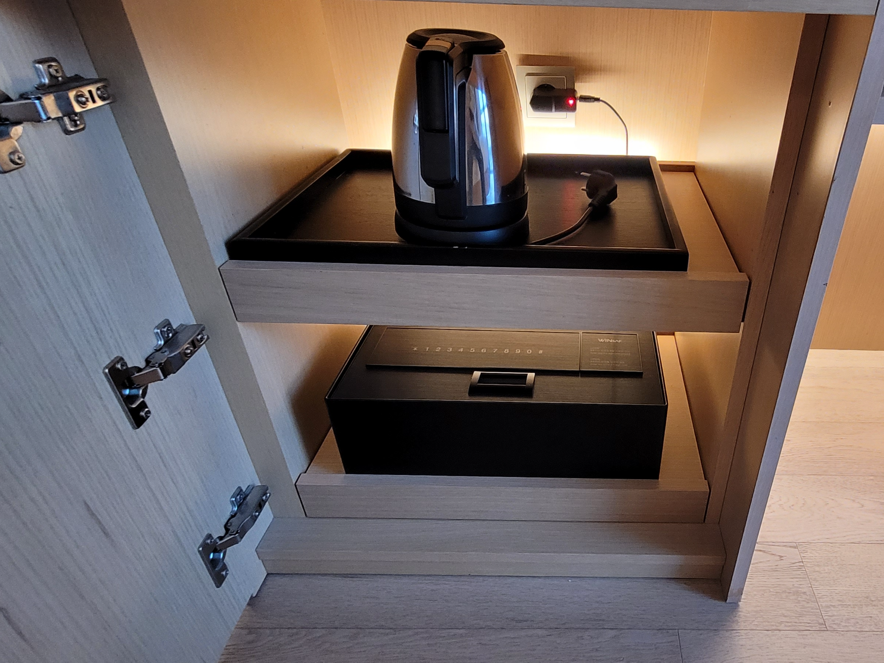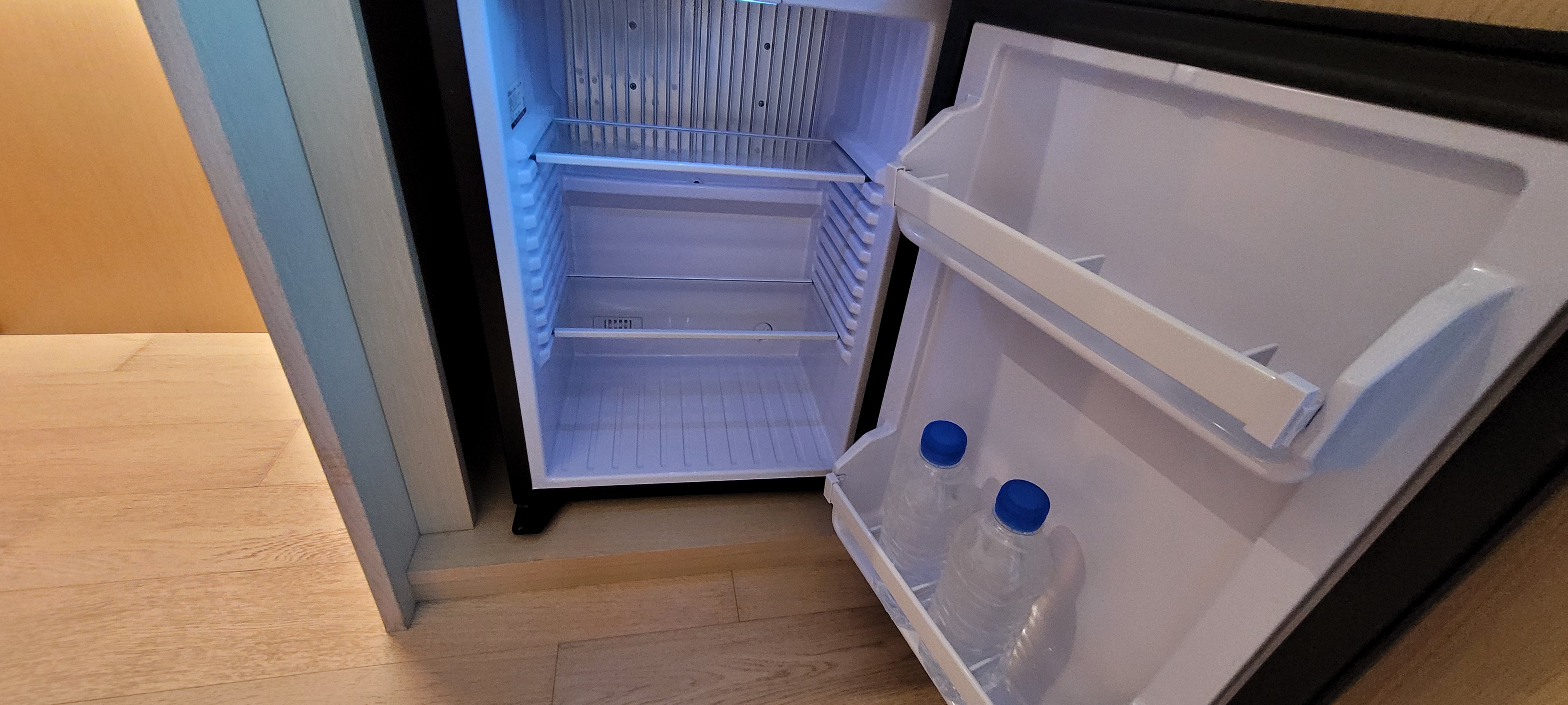 미니 냉장고에 생수 두병을 매일 새로 넣어준다. 기타 간단한 차와 티스푼, 유리잔, 머그컵 등이 준비되어 있어서 원하면 사용 가능하다. 커피포트와 헤어 드라이기도 준비되어 있다.