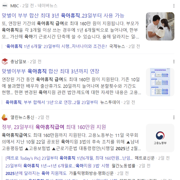육아휴직제도는 일정기간 자녀의 양육을 위해 휴직할 수 있도록 하는 제도입니다. 아이가 어릴때는 부모의 손이 많이 필요로 하기 때문에 육아휴직은 정말 중요한 제도 중 하나입니다. 2025년부터는 최대 1년 육아휴직이 1년 6개월까지 쓸수 있는 것으로 개선이 됩니다. 물론 모든 부모에게 해당되지는 않고 부모 모두 3개월 이상 사용시 또는 한부모 / 중증장애아동부모의 경우입니다.